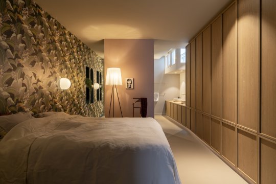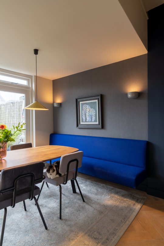 Maatwerk interieur met eiken kastenwand, geïntegreerd badmeubel, kleurgecoördineerde kledingkasten en opvallende blauwe wandbank, in samenwerking met Sterke Projecten en Paul Noordijk.