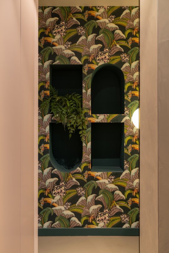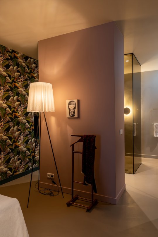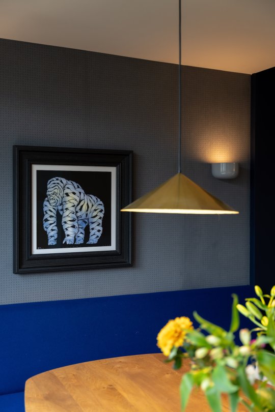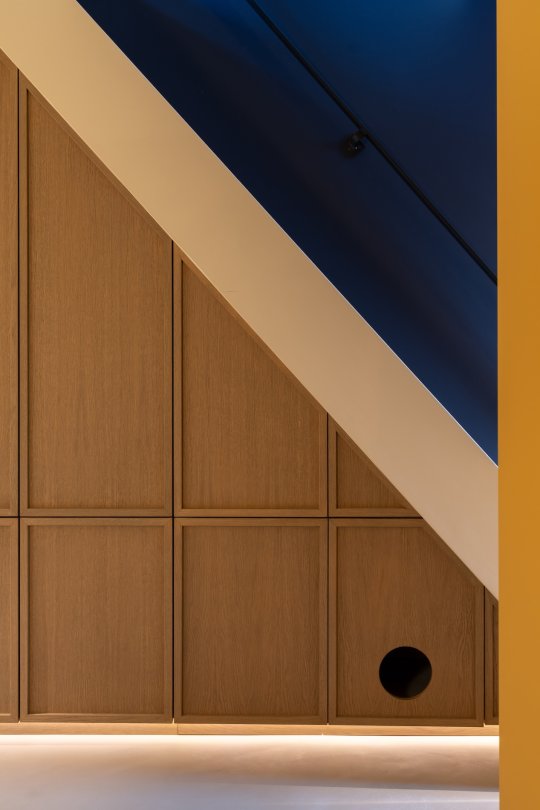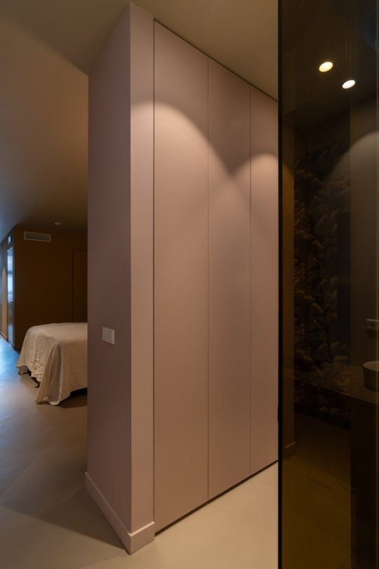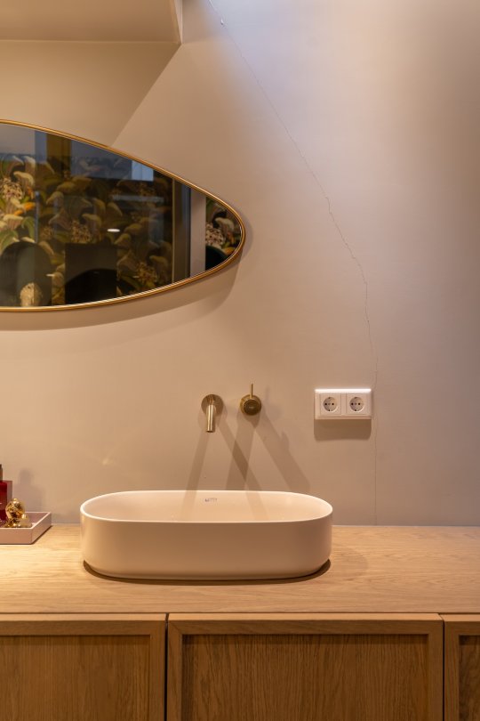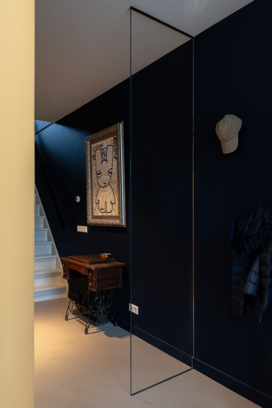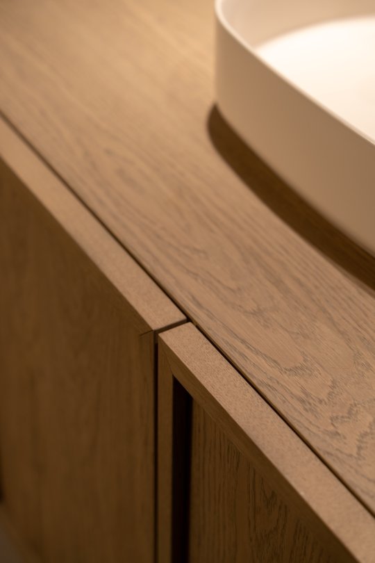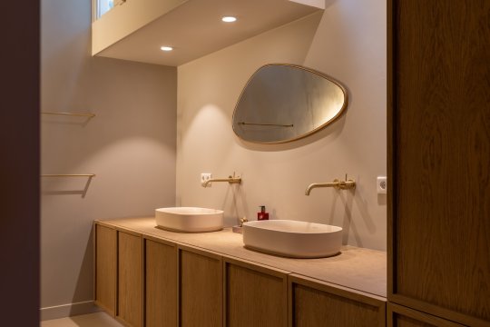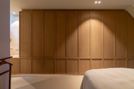 Centraal staat een lange eiken kastenwand met klassieke paneeldeuren, waarin subtiel een badmeubel is geïntegreerd. In een nis zijn kledingkasten geplaatst, meegespoten in dezelfde kleur als de wand, waardoor ze volledig opgaan in het interieur. Daarnaast springt de op maat gemaakte blauwe wandbank in het oog – een krachtig kleuraccent in het ontwerp. Tot slot completeert een zwevend dressoir in strak spuitwerk het geheel en zorgt voor extra opbergruimte zonder visuele belasting.