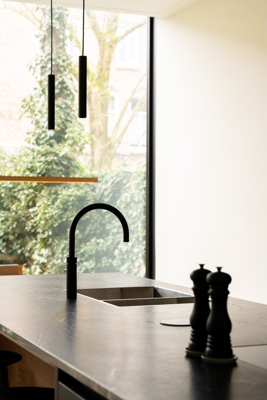 Qua apparatuur is gekozen voor hoogwaardige oplossingen: twee Miele stoomovens, een Quooker voor direct kokend water en een Bora Pure X inductiekookplaat met geïntegreerde afzuiging, die zorgt voor een strak en open aanzicht.