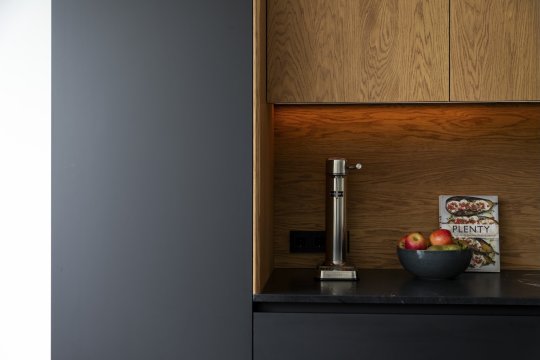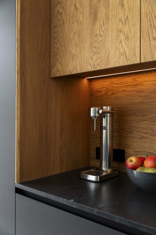 Een moderne, stijlvolle keuken in samenwerking met NEST architectuur, met eiken accenten, Piombo fronten en een granieten blad, voorzien van hoogwaardige apparatuur.