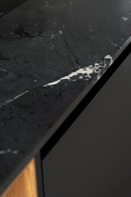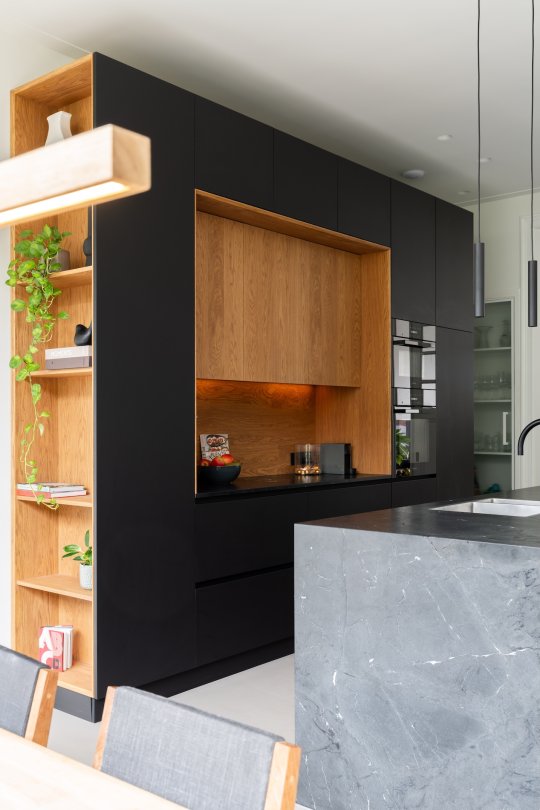 De keuken is voorzien van een nis en een kast op de kopse kant, beide uitgevoerd in eikenhout, wat zorgt voor warmte en karakter. De fronten zijn vervaardigd uit DecoLegno Piombo en geven het geheel een eigentijdse, matte uitstraling. Het werkblad is uitgevoerd in Nero Cielo graniet, wat luxe en duurzaamheid samenbrengt.